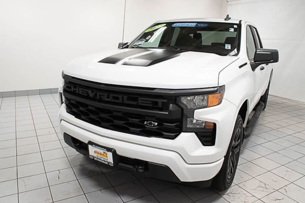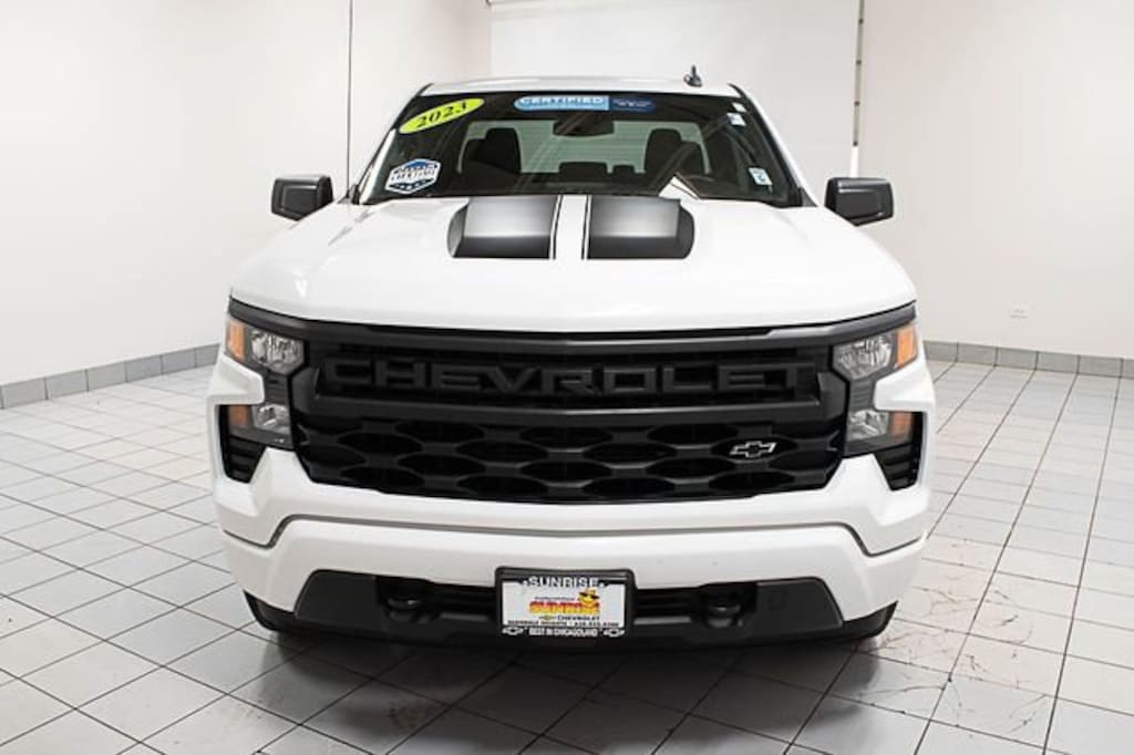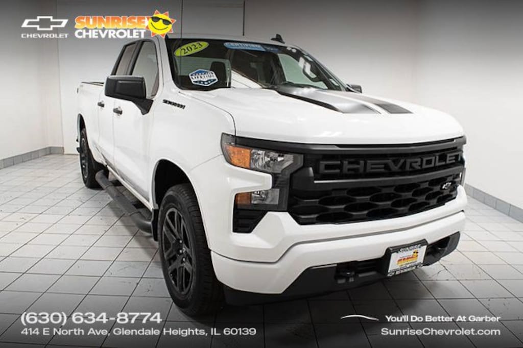 Recent Arrival! 2023 Chevrolet Certified. CARFAX One-Owner. Clean CARFAX. Silverado 1500 4WD Custom APPLE CAR PLAY, Bluetooth, Backup Camera, *** GM CERTIFIED ***, 8-Speed Automatic, 4WD, Black Cloth, Wheels: 20" x 9" High Gloss Black Painted Alum.Chevrolet Certified Pre-Owned Details:* Warranty Deductible: $0* Vehicle History* Roadside Assistance* Transferable Warranty* Limited Warranty: 12 Month/12,000 Mile (whichever comes first) from certified purchase date* 172 Point Inspection* 24 months/24,000 miles (whichever comes first) Certified Pre-Owned Scheduled Maintenance Plan and 3 days/150 miles (whichever comes first) Vehicle Exchange Program. SiriusXM 3-month trial subscription.* Powertrain Limited Warranty: 72 Month/100,000 Mile (whichever comes first) from original in-service dateThank you for making your way to Sunrise Chevrolet, your New Chevrolet and certified Chevy dealer in Glendale Heights! Our Chevrolet dealership goes the extra mile every day for our Chicagoland customers. We have one of the "Largest" selections of GM Certified vehicles in the Chicagoland area.
