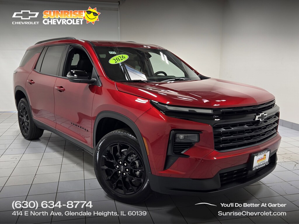 1st & 2nd Row All-Weather Floor Liners (LPO), 3rd Row All-Weather Floor Liner (LPO), 3rd row seats: split-bench, 4-Way Manual Front Passenger Seat Adjuster, 4-Wheel Disc Brakes, 6 Speakers, 6-Speaker Audio System Feature, 8-Way Power Driver Seat Adjuster, ABS brakes, Air Conditioning, AM/FM radio: SiriusXM with 360L, Apple CarPlay/Android Auto, Auto High-beam Headlights, Automatic temperature control, Brake assist, Bumpers: body-color, Child-Seat-Sensing Airbag, Compass, Delay-off headlights, Driver door bin, Driver vanity mirror, Dual front impact airbags, Dual front side impact airbags, Electronic Stability Control, Emergency communication system: OnStar, Floor Liner Package (LPO), Four wheel independent suspension, Front anti-roll bar, Front Bucket Seats, Front Center Armrest, Front dual zone A/C, Front reading lights, Fully automatic headlights, Heated door mirrors, Heated Driver & Front Passenger Seats, Heated front seats, Heated steering wheel, High Gloss Black Door Upper Molding, Illuminated entry, Integrated Cargo Liner (LPO), Low tire pressure warning, Midnight/Sport Edition, Navigation System, Occupant sensing airbag, Outside temperature display, Overhead airbag, Overhead console, Panic alarm, Passenger door bin, Passenger vanity mirror, Power door mirrors, Power driver seat, Power Liftgate, Power steering, Power windows, Preferred Equipment Group 1LT, Premium Cloth Seat Trim, Radio data system, Radio: Audio System w/17.7" Diagonal Display, Rear air conditioning, Rear anti-roll bar, Rear reading lights, Rear window defroster, Rear window wiper, Remote keyless entry, Security system, SiriusXM w/360L Trial Subscription, Speed control, Speed-sensing steering, Spoiler, Steering wheel mounted audio controls, Tachometer, Telescoping steering wheel, Tilt steering wheel, Traction control, Trip computer, Turn signal indicator mirrors, Variably intermittent wipers, Voltmeter, Wheels: 20" High Gloss Black Painted Aluminum.2026 Chevrolet Traverse LT Radiant Red Tintcoat20/27 City/Highway MPGThank you for making your way to Sunrise Chevrolet, your New Chevrolet and certified Chevy dealer in Glendale Heights! Our Chevrolet dealership goes the extra mile every day for our Chicagoland customers. We have one of the "Largest" selections of GM Certified vehicles in the Chicagoland area. Price Includes:$1500 - Consumer Cash Program. Exp. 01/02/2026 All consumers qualify.