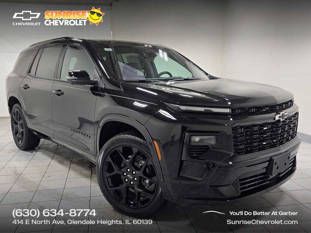 Recent Arrival! AWD, 12 Speakers, 1st & 2nd Row All-Weather Floor Liners (LPO), 3rd Row All-Weather Floor Liner (LPO), 3rd row seats: split-bench, 4-Wheel Disc Brakes, 6-Way Power Front Passenger Seat Adjuster, 8-Way Power Driver Seat Adjuster, ABS brakes, Air Conditioning, AM/FM radio: SiriusXM with 360L, Apple CarPlay/Android Auto, Auto High-beam Headlights, Auto tilt-away steering wheel, Auto-dimming door mirrors, Automatic temperature control, Bose Premium 12-Speaker Audio System Feature, Brake assist, Bumpers: body-color, Child-Seat-Sensing Airbag, Compass, Delay-off headlights, Driver 4-Way Power Lumbar Seat Adjuster, Driver door bin, Driver vanity mirror, Dual front impact airbags, Dual front side impact airbags, Electronic Stability Control, Emergency communication system: OnStar, Exterior Parking Camera Rear, Floor Liner Package (LPO), Four wheel independent suspension, Front anti-roll bar, Front Bucket Seats, Front Center Armrest, Front dual zone A/C, Front Passenger 4-Way Power Lumbar Seat Adjuster, Front reading lights, Fully automatic headlights, Garage door transmitter, Heated door mirrors, Heated Driver & Front Passenger Seats, Heated front seats, Heated rear seats, Heated steering wheel, Illuminated entry, Integrated Cargo Liner (LPO), Low tire pressure warning, Memory seat, Navigation System, Occupant sensing airbag, Outside temperature display, Overhead airbag, Overhead console, Panic alarm, Passenger door bin, Perforated Leather-Appointed Seat Trim, Power door mirrors, Power driver seat, Power Liftgate, Power passenger seat, Power steering, Power windows, Radio data system, Radio: Audio System w/17.7" Diagonal Display, Rain sensing wipers, Rear air conditioning, Rear anti-roll bar, Rear reading lights, Rear window defroster, Rear window wiper, Remote keyless entry, Security system, SiriusXM w/360L Trial Subscription, Speed control, Speed-sensing steering, Spoiler, Sport steering wheel, Steering wheel memory, Steering wheel mounted audio controls, Tachometer, Telescoping steering wheel, Tilt steering wheel, Traction control, Trip computer, Turn signal indicator mirrors, Variably intermittent wipers, Ventilated Driver & Front Passenger Seats, Ventilated front seats, Voltmeter, Wheels: 22" High Gloss Black Painted Aluminum.2026 Chevrolet Traverse RS Mosaic Black MetallicPriced below KBB Fair Purchase Price!Thank you for making your way to Sunrise Chevrolet, your New Chevrolet and certified Chevy dealer in Glendale Heights! Our Chevrolet dealership goes the extra mile every day for our Chicagoland customers. We have one of the "Largest" selections of GM Certified vehicles in the Chicagoland area.
